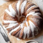 I recommend freezing this cake before glazing it — once completely cooled, wrap it tightly in plastic wrap and then foil. It freezes well for up to 3 months. When ready to enjoy, thaw it in the fridge overnight, then add the cinnamon sugar topping and glaze just before serving for the freshest taste.