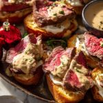 Delight your holiday guests with these elegant Beef Tenderloin Crostini topped with a rich Parmesan Wine Cream Sauce. This recipe features tender, perfectly roasted beef tenderloin served on toasted baguette slices spread with whipped goat cheese and a touch of honey, finished with a luscious wine cream sauce infused with garlic and fresh herbs for a festive and flavorful appetizer.