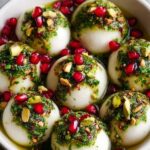Burrata Balls: A Festive, Elegant Appetizer featuring creamy burrata cheese complemented by the sweetness of pomegranate seeds, the crunch of pistachios, and the freshness of mint leaves, all enhanced with a drizzle of balsamic glaze and extra-virgin olive oil. Perfect for entertaining or special occasions, this no-cook appetizer offers a delightful combination of textures and flavors.