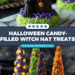 Candy-filled Witch Hats are a fun and festive Halloween treat made with waffle ice cream cones dipped in chocolate, decorated with sprinkles and sour belts, filled with candy, and topped with chocolate cookies. These adorable and edible witch hats are perfect for parties or as spooky treats for kids and adults alike.