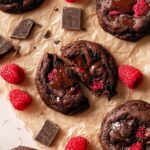 These decadent Chocolate Raspberry Cookies combine the rich, nutty flavor of browned butter with dark and milk chocolate chunks and fresh raspberries for a fudgy, brownie-like texture. Perfectly crisp on the edges with a soft, chewy middle, these cookies offer a sophisticated twist on a classic treat with their luscious tart berry bursts and a sprinkle of flaky salt on top.