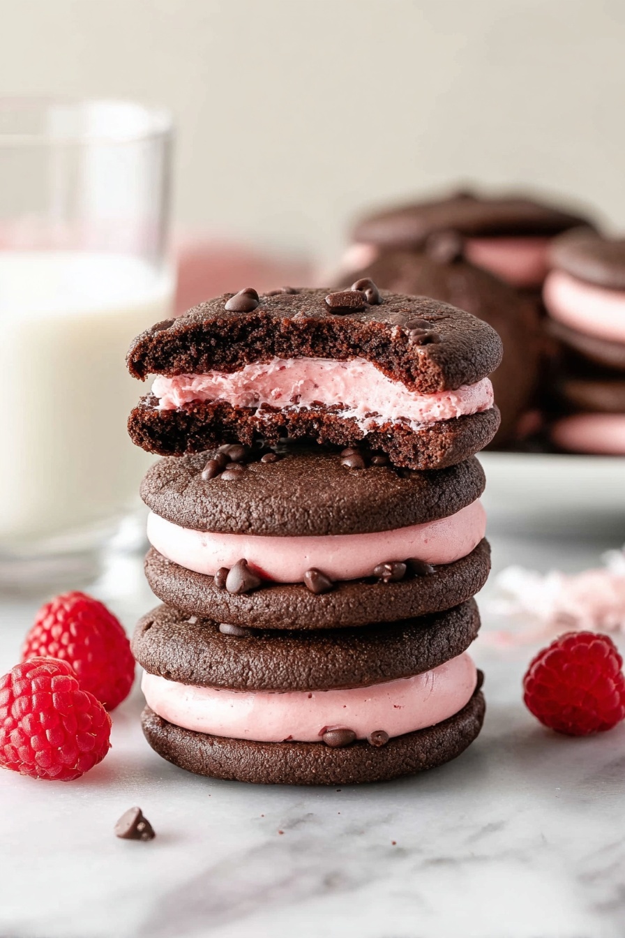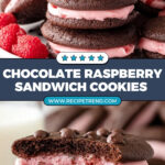 Delicious homemade Chocolate Raspberry Sandwich Cookies featuring rich chocolate cookies filled with a luscious raspberry cream cheese frosting. Perfectly balanced between deep cocoa flavor and fresh raspberry tang, these cookies make an irresistible treat for any occasion.