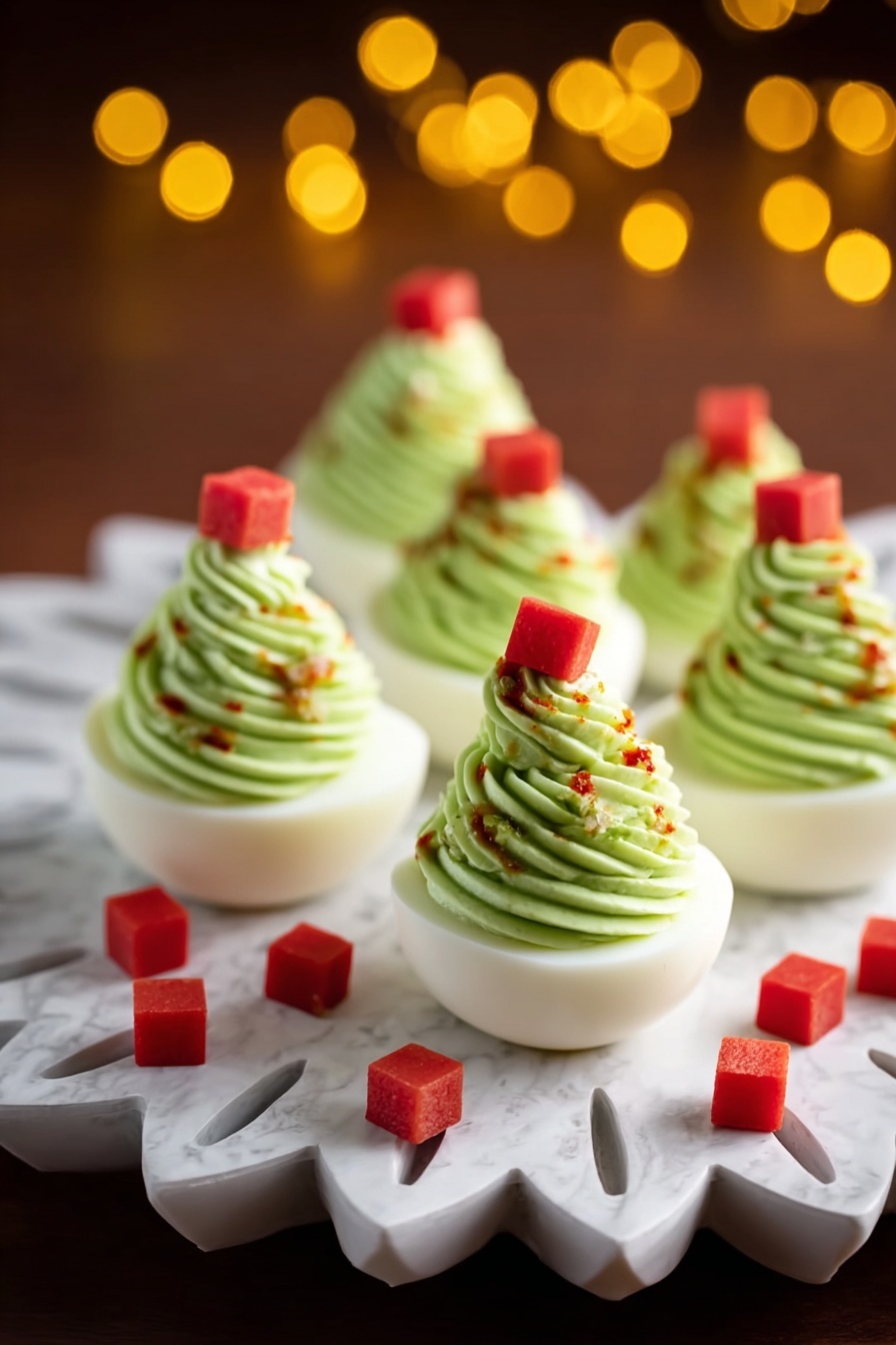 One year, I arranged the deviled eggs on a large platter lined with fresh pine branches and dusted lightly with powdered sugar to look like a snowy forest floor — guests were delighted! You could also use a tiered serving tray and sprinkle edible glitter for extra sparkle. If you’re feeling crafty, pipe a star shape with a small piece of red pepper or a tiny edible gold star candy at the top of each tree for that perfect finishing touch.