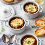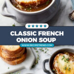 This classic French Onion Soup features caramelized yellow onions simmered in a savory broth with white wine, topped with toasted baguette slices and melted Gruyère cheese. A comforting and flavorful soup perfect for cozy dinners.