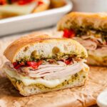 This Copycat Starbucks Turkey Pesto Sandwich features toasted ciabatta bread filled with savory deli turkey, fresh basil pesto, provolone cheese, and roasted red peppers. It’s grilled to perfection on a panini press for a warm, melty, and satisfying lunch or snack that mimics the popular café favorite.