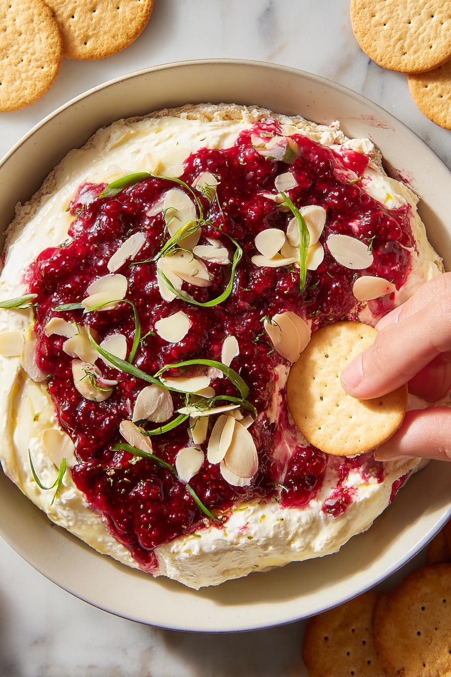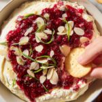 Spoon the fluffy cream cheese spread into your serving dish, then dollop or spoon the cranberry sauce on top — don’t worry about making it too neat; I love the rustic look. Sprinkle almonds and sliced scallions over everything, season with a bit of black pepper if you like a touch of spice, and finish with a drizzle of extra-virgin olive oil. Serve alongside your favorite crackers or bagel chips, and get ready for compliments!