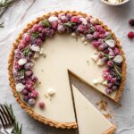 I often top this tart with a handful of sugar-coated cranberries—they add sparkle and a festive touch. White chocolate chips sprinkled on top make it extra pretty and add little bursts of sweetness and texture. For a fresh twist, a few mint leaves or edible flowers brighten up the look and add an herbal note.