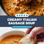 Hearty and creamy Sausage Soup made with mild Italian sausage, tomatoes, cream cheese, and Parmesan, packed with rich flavors and perfect for a comforting meal.