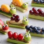 Fill celery stalks again with peanut butter or cream cheese. Line up grapes, blueberries, or grape tomatoes on top to form your caterpillar’s body and head. I like alternating colors for visual interest. Add candy eyes to the “head” fruit and use tiny celery or radish matchsticks for antennae, secured with small dabs of filling. It always surprises me how such simple steps turn raw veggies and fruit into whimsical snack art!