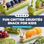 Critter Crudités is a fun and creative appetizer featuring charming edible snails and caterpillars crafted from fresh vegetables and fruits, filled and held together with creamy peanut butter or cream cheese. Perfect for kids’ parties or as a whimsical snack, this healthy platter combines crunchy celery with colorful slices of apple, orange, kiwi, cucumber, tomatoes, grapes, and blueberries, decorated with cashews and candy eyes to bring delightful garden critters to life.