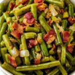 Delicious and easy Crock Pot Green Beans recipe featuring fresh green beans cooked slowly with crispy bacon, onions, garlic, and flavorful seasonings. Perfect as a comforting side dish with minimal prep time and hearty flavors developed through slow cooking.