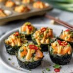 These Easy Baked Salmon Sushi Cups combine the flavors of classic sushi with a convenient, oven-baked twist. Featuring a savory salmon mixture seasoned with soy sauce, Kewpie mayo, sriracha, and sesame oil, layered over seasoned sushi rice and wrapped in nori, these sushi cups are perfect for a quick appetizer or party snack. Garnished with furikake and green onions, they deliver a burst of umami and spice in every bite.