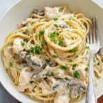 - Combine casserole ingredients: Into the pot with the sauce, add the cooked pasta, shredded chicken, sautéed mushrooms and onions, and chopped parsley. Stir well to combine everything evenly. Add some or all of the reserved pasta water to loosen the sauce if desired.