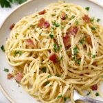 I always finish my Carbonara with a sprinkle of roughly chopped fresh parsley—not just for color but because it adds a nice fresh contrast to the rich sauce. Sometimes a little extra crack of black pepper on top amps up the flavor. For a special touch and if you’re feeling decadent, a few shavings of Parmesan curls on top are gorgeous.