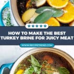 This Easy Turkey Brine Recipe enhances the flavor and moisture of your turkey through a zesty citrus and herb brine combined with a garlic herb compound butter. The turkey is brined in a fragrant mixture of lemons, oranges, rosemary, sage, thyme, peppercorns, maple syrup, and apple juice, then roasted to perfection for a juicy, tender centerpiece perfect for any feast.