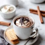 Indulge in a rich and velvety European-style hot chocolate made with creamy whole milk, heavy cream, cocoa powder, and high-quality dark chocolate. This decadent beverage is thickened slightly with cornstarch for a luscious texture, sweetened to taste with powdered sugar, and topped with luxurious homemade whipped cream and chocolate shavings. Perfect for cozy afternoons or a comforting treat on chilly days.