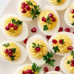 - Garnish and Serve: Top each deviled egg with one parsley stem and 2-3 bright pomegranate seeds to add color and freshness. Serve immediately, or refrigerate until ready to serve.