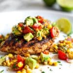 My favorite sides to serve alongside this chicken are cilantro-lime rice, black beans, or a light, crisp green salad. Sometimes I’ll grill up some fresh corn on the cob to echo the corn in the salsa. It rounds out the meal perfectly and keeps everything feeling summery and fresh.