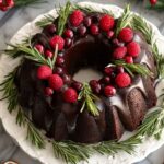 This Gingerbread Chocolate Bundt Cake Christmas Wreath combines the rich flavors of cocoa and lebkuchen spices with tender buttermilk and sour cream, baked in a classic bundt pan. The cake is infused with fresh brewed coffee to enhance the chocolate depth and studded with chopped Lebkuchen chocolate pieces. Finished with a glossy semi-sweet chocolate glaze and decorated festively with fresh cranberries, raspberries, and rosemary sprigs, this cake is perfect for holiday celebrations.