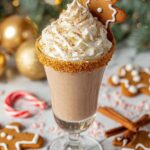 A festive and creamy Gingerbread Martini that blends the warm flavors of gingerbread vodka, coffee liqueur, and Irish cream with a smooth half-and-half base. The cocktail is beautifully garnished with a white chocolate and gingerbread cookie-rimmed glass, topped with whipped cream and a dusting of cinnamon, perfect for holiday celebrations or cozy evenings.