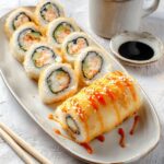 - Batter and Fry: Using the leftover tempura batter from making shrimp tempura, dip each sushi roll completely into the batter. Carefully deep fry each roll in the hot oil for 2-3 minutes, turning to ensure the roll is golden brown on all sides. Remove and place on paper towels to drain excess oil.
