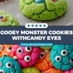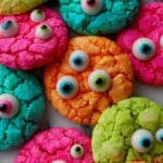 - Add candy eyeballs: While the cookies are still warm, press candy eyeballs onto the tops to create fun monster faces. Allow cookies to cool slightly before serving. ENJOY!