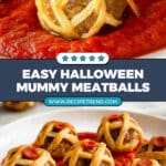Serve your Halloween Mummy Meatballs warm with your favorite dipping sauce. I love piling them on a festive platter with marinara for dipping—guests inevitably come back for seconds. If you want to make it even easier, nestle these on top of some pasta or roasted veggies for a fun Halloween dinner.
