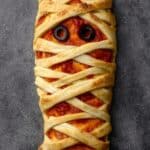 In that empty space at the top, spread a little extra sauce and pop two olive halves in to make the eyes. It’s such a quick and cute detail that really brings your mummy to life. Transfer the parchment paper with your mummy pizza onto the baking sheet and bake for about 20 minutes or until the dough turns golden brown and the cheese is bubbly. You’ll know it’s ready when the braid is crisp and slightly puffed.
