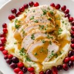 This turkey with gravy pairs perfectly with classic mashed potatoes (I’m obsessed with creamy crockpot cheesy mashed potatoes), cranberry sauce, and roasted green beans or carrots. For a little extra indulgence, buttery dinner rolls are a must to soak up that luscious gravy!