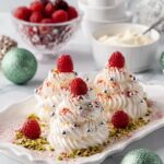 Mini Pavlova Christmas Trees are elegant and festive meringue treats perfect for holiday celebrations. Crisp on the outside and light and airy inside, these individual pavlovas are beautifully decorated with whipped cream, silver cachous, raspberries, pistachios, and strawberries to resemble miniature Christmas trees, making them a delightful centerpiece dessert.