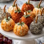 Mini Pumpkin Cheese Balls are a festive and flavorful appetizer perfect for fall gatherings. Soft cream cheese combined with sharp cheddar, roasted red peppers, and a hint of cayenne is shaped into bite-sized balls, coated with crunchy coatings like crushed Nacho Cheese Doritos, paprika, and black sesame seeds, and garnished with pretzel sticks and parsley to resemble pumpkins. These colorful cheese balls offer a delightful combination of creamy, spicy, and savory flavors with a fun presentation that will impress guests.