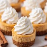 Leftovers from this Mini Pumpkin Cheesecakes Recipe keep beautifully in the fridge for up to three days. I store them in an airtight container with parchment paper between layers to keep them from sticking together and to preserve freshness.