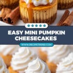- Chill and serve: Once cooled, cover the mini cheesecakes tightly with plastic wrap and refrigerate for at least 2 hours or overnight to let them set fully. When ready to serve, carefully remove the cheesecakes from the pan and liners if desired. Top with whipped cream, caramel sauce, or a dusting of pumpkin pie spice as preferred.