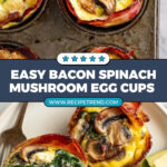 These Mushroom Spinach Bacon Egg Cups are a delicious and satisfying breakfast or brunch option featuring crispy bacon wrapped around a savory mixture of sautéed mushrooms, spinach, fluffy eggs, and feta cheese. Baked to perfection in a muffin tin, these egg cups are easy to prepare and perfect for meal prep or a grab-and-go meal.
