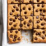 - Transfer and Top: Spread the dough evenly into the prepared baking pan using an offset spatula. Sprinkle the remaining 1/4 cup chocolate chips evenly over the surface, adding more if desired.