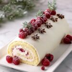 I adore dusting the cake roll with powdered sugar — it adds a snowy look that’s so cozy and festive. Fresh raspberries scattered on top give a pop of color and a tangy bite, while sugar-coated rosemary and star anise add an elegant crunch and a woodsy aroma that really brings it all home.