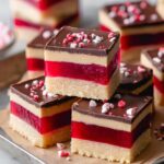 This Raspberry Caramel Millionaires Shortbread is a decadent gluten-free and vegan dessert featuring a buttery shortbread base, a vibrant raspberry jelly layer, a rich cashew caramel, and a smooth vegan chocolate topping. Perfect for those seeking an indulgent treat without dairy or gluten, it’s a delightful combination of tart, sweet, and salty flavors with a luxurious texture.