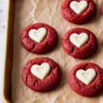 Delightfully soft and chewy red velvet cookies with a subtle cocoa flavor, topped with creamy white chocolate peanut butter hearts for a festive and indulgent treat. Perfect for gifting or enjoying with a glass of milk.