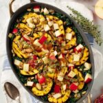 This Roasted Delicata Squash with Apples recipe combines tender, caramelized delicata squash and sweet gala apples with warm herbs and toasted nuts, all lightly dressed with a tangy apple cider vinaigrette. The dish is roasted to bring out rich, natural flavors, then finished with a gentle wilt of kale and fresh herbs, creating a perfect fall-inspired side dish bursting with texture and seasonal goodness.