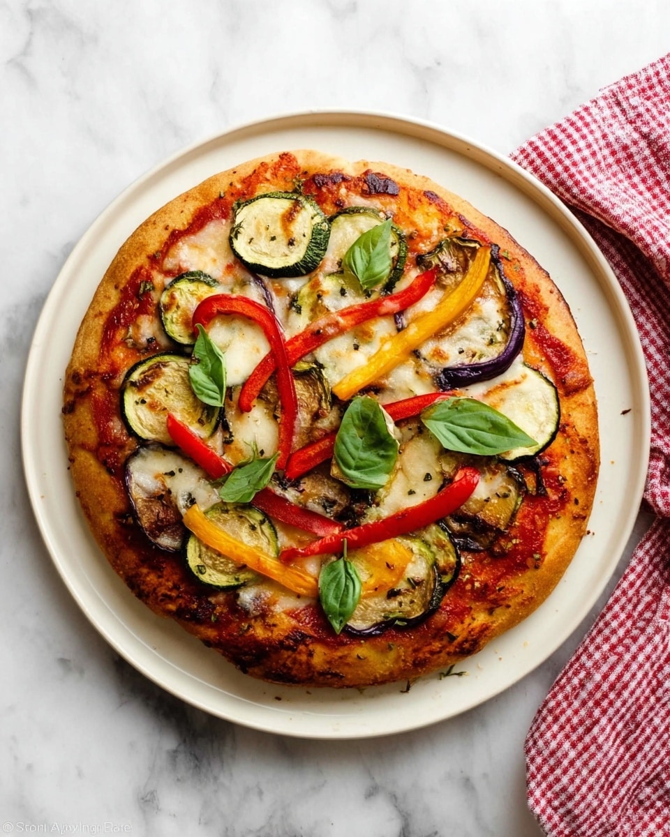 This wholesome roasted vegetable whole wheat pizza features a crisp, flavorful crust made from whole wheat dough topped with a medley of tender roasted vegetables, rich tomato sauce, and melted mozzarella cheese. Perfectly roasted eggplant, bell pepper, zucchini, and onions come together for a delicious, nutritious homemade pizza experience ideal for a satisfying meal.