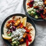 You can swap the Greek yogurt for a dairy-free yogurt alternative like coconut or almond-based yogurt to make the tzatziki. Skip the feta or use a plant-based cheese to keep the flavor profile still tasty.