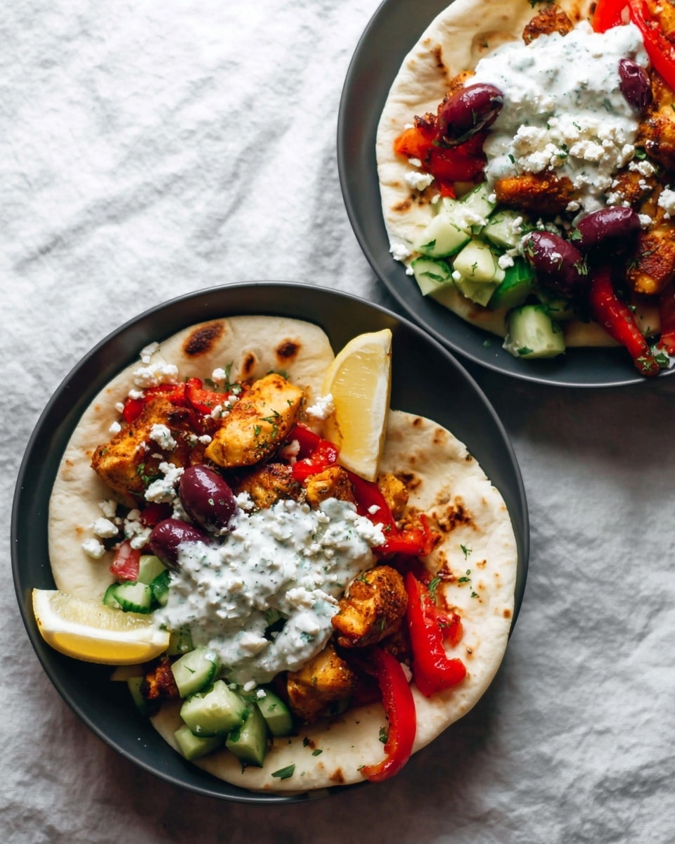 - Serve and Enjoy: Let everyone build their own pitas or bowls by layering the chicken, peppers, fresh vegetables, olives, feta, and a generous dollop of tzatziki inside the flatbreads. Enjoy the combination of salty, briney, and crunchy textures and flavors!