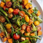 A vibrant and healthy sheet pan roasted vegetables recipe featuring sweet potato, broccoli, asparagus, and cherry tomatoes, seasoned with smoked paprika and garlic for a deliciously easy side dish.
