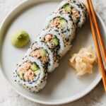 - Slicing and serving: Using a sharp serrated knife dipped in water between cuts to prevent sticking, slice the sushi roll into pieces approximately ¾ – 1 inch thick. Discard or trim edges for tidy presentation if desired. Arrange on a plate and serve with wasabi, pickled ginger, and soy sauce if preferred.