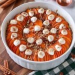 A classic Thanksgiving side dish featuring thinly sliced sweet potatoes baked in a buttery, spiced brown sugar sauce, topped with crunchy pecans and toasted mini marshmallows for a sweet and savory delight.