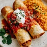 For special occasions, I’ve rolled these chimichangas a bit smaller, popped them upright in a baking dish, topped them with enchilada sauce and cheese, and baked until bubbly—giving a fun twist on traditional enchiladas. They also make excellent finger foods for parties when sliced into bite-sized pieces with toothpicks.