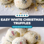 Delightfully creamy and festive, these White Christmas truffles combine smooth white chocolate and rich cream with crunchy pistachios and tart dried cranberries, all coated in a snowy layer of desiccated coconut. Perfect as a holiday treat or gift, these no-bake truffles are easy to make and irresistibly delicious.