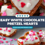White Chocolate Pretzel Hearts are a charming and delicious treat perfect for Valentine’s Day or any festive occasion. Crisp mini pretzels are topped with smooth, melted white chocolate almond bark shaped into hearts and decorated with festive heart sprinkles. These sweet and salty snacks are easy to make, require no baking, and are perfect for sharing or gifting.
