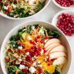 A vibrant and refreshing Winter Salad featuring a nutritious mix of kale, spring salad greens, cabbage, carrots, crisp apples, candied nuts, crumbled goat cheese, and pomegranate arils, all tossed in a tangy and slightly sweet red wine vinaigrette. Perfect for a light meal or a festive side dish.